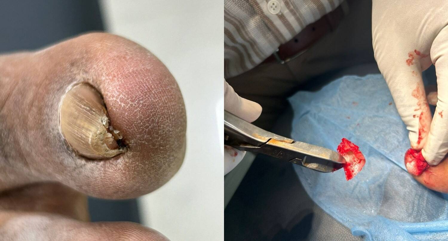 A 62-year-old patient visited G Square Skin, Hair and Aesthetic Clinic, Hubli, with severe pain and curvature of the toenail, making it difficult to wear shoes or walk comfortably.